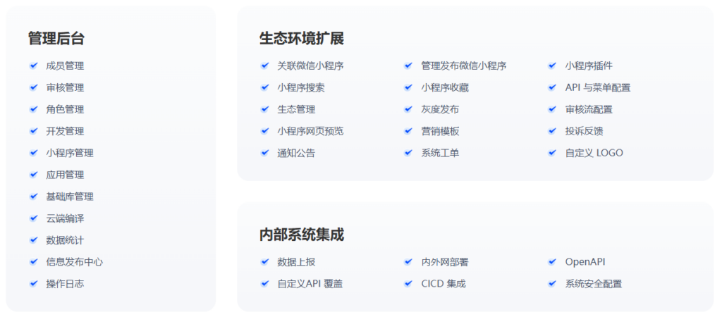 支持对企业成员角色管理,对不同来源的小程序与应用进行统一审核、上下架管理、 A-B test、灰度发布、热更新等。